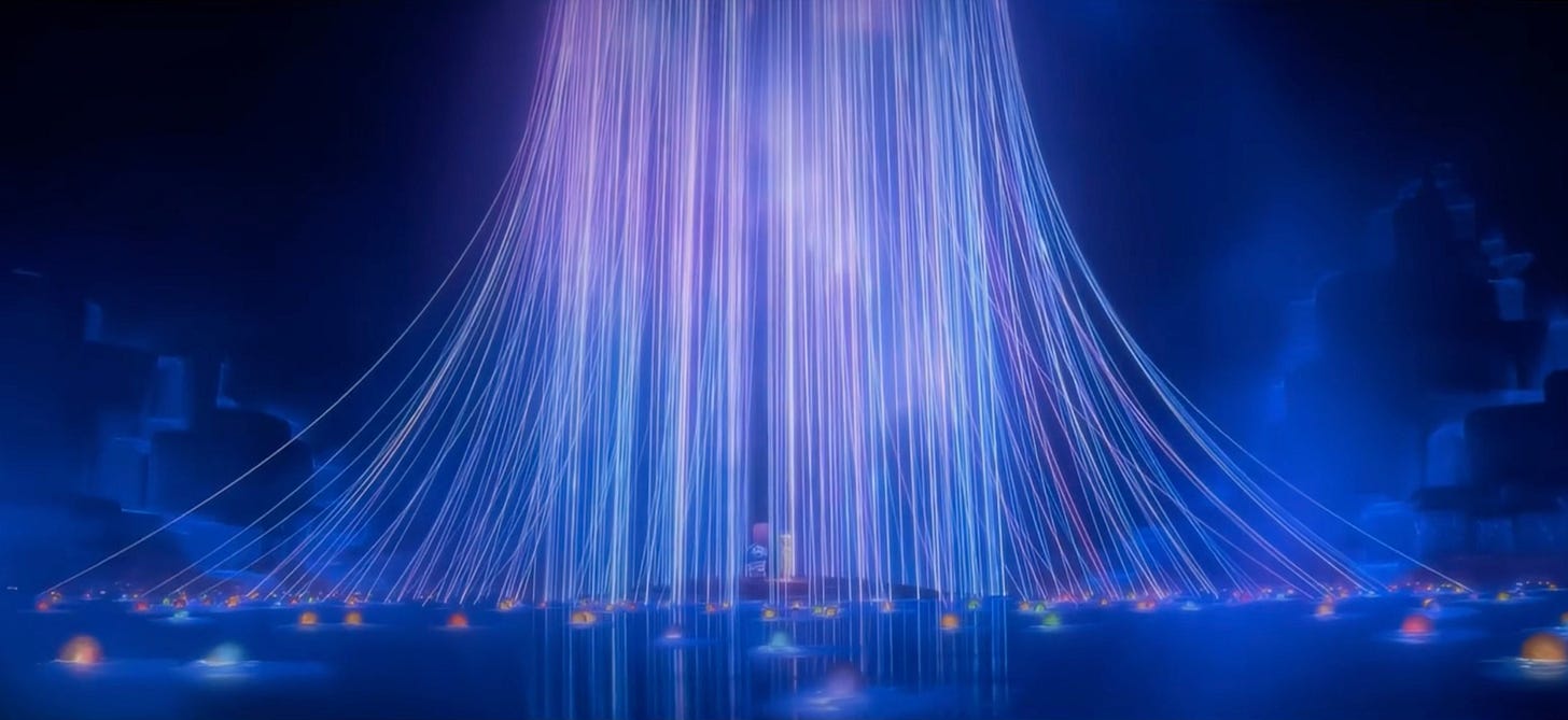 In its way, this idea is depicted in Inside Out 2 through two new elements: the Belief System and the Sense of Self. The Belief System takes the form of a pool, located in the lowest parts of Riley's mind, where core memories "sink in" and create "threads" of personality. Collectively, these memories form beliefs and create Riley's Sense of Self.